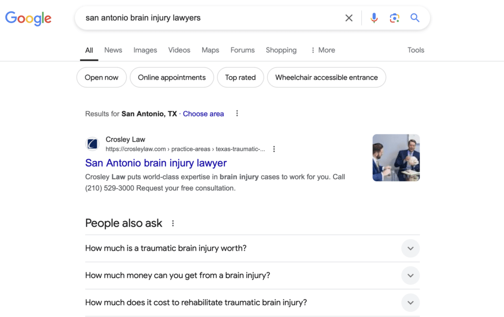 We’re all familiar with Google search engine results pages (SERP). Those lists of little blue links have been the way we searched the web and connected with audiences. For example, when you type “San Antonio brain injury lawyer” into Google, you’re used to getting this.