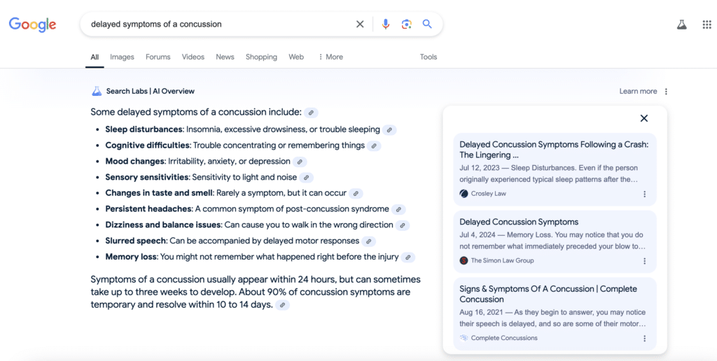As a marketer, the goal is to have injured people and their caregivers click on the link, read your content, and give you a call. And, if you are SEO-driven, you probably have pages that rank not just for conversion-driven keywords like “San Antonio brain injury lawyer,” but also educational terms like “delayed symptoms of a concussion.”